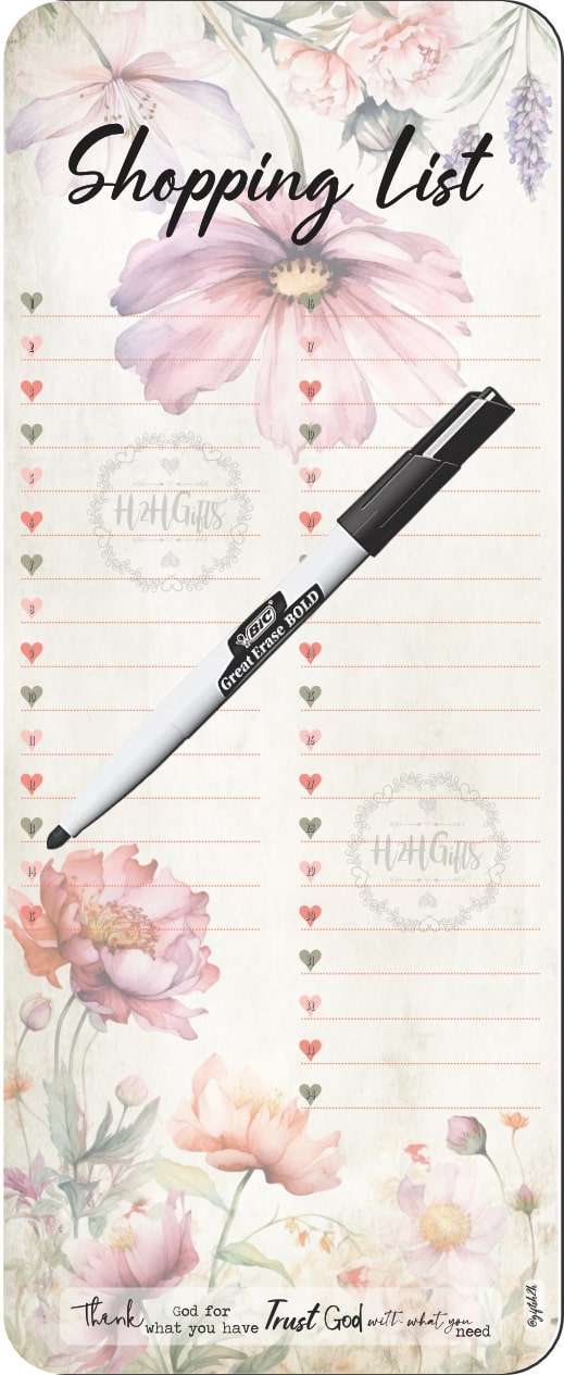 Magnetic Shopping List with magnetic White Board Marker to add some color to your kitchen and help you jot down all the things you need to buy or remember. Making life easier for those busy days when you just can’t seem to remember everything.